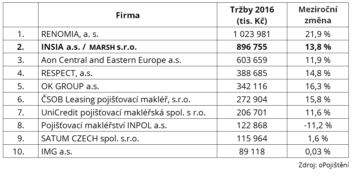 Odborný portál oPojištění.cz zveřejnil svůj pravidelný žebříček největších pojišťovacích makléřů v Česku za uplynulý rok. Z výsledků je zřejmé, že nejúspěšnější makléři většinou těžili z obecného růstu ekonomiky a dále posilovali své tržní pozice. Sedmička nejvýše umístěných společností vykázala za rok 2016 dvojciferný nárůst tržeb. Skupině MARSH/INSIA narostly meziročně výkony o 13,8 %.